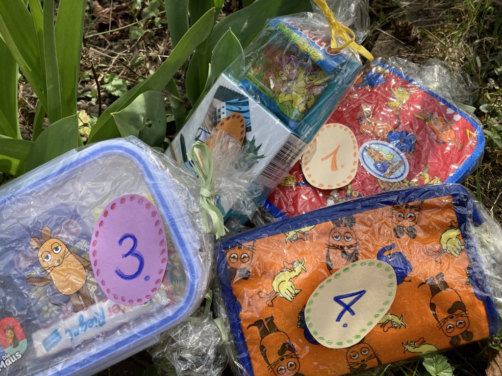 Die Preise für die schönsten Werke konnten sich sehen lassen. 1. Platz: Ein Federmäppchen von „der Maus“ 2. Platz: Eiermalfarben 3. Platz: Eine Brotdose von „der Maus“ 4. Platz: Eine kleine Tasche von „der Maus“ Und für alle Gewinner einen großen Schokoladenhasen.
